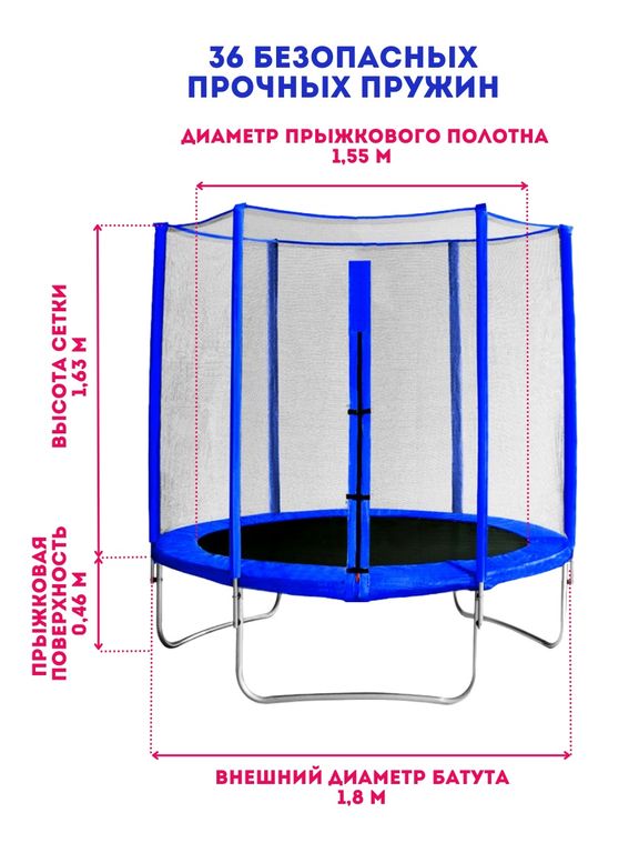 Внешний диаметр батута 1,8 м, в нем используется 36 пружин, выполненных из высококачественной углеродистой стали, что позволяет увеличить срок службы батута защищая от износа. Пружины закрыты износостойким защитным матом, сделанного из специального материала стойкого к истиранию. Прыжковое полотно выполнено из перматрона – это эластичный, прочный материал устойчивый воздействию ультрафиолета, воды и температуры. При этом абсолютно безопасный и экологически чистый материал, перемещаться по которому очень комфортно.