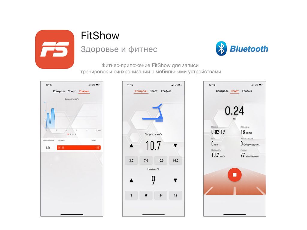 *Также, имеется возможность синхронизации беговой дорожки с мобильным устройством при помощи приложения FitShow/Kinomap/Zwfit, с возможностью управления беговой дорожкой и сохранения тренировок.