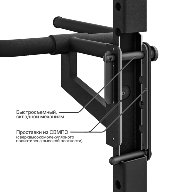 Брусья навесные с быстросъемным откидным механизмом для крепления к базовой шине BS-750 или BS-2250. Крепежный механизм позволяет быстро и без особых усилий изменять высоту снаряда. Брусья станут отличным дополнением к турнику на базовую шину BS-2250. При необходимости их можно снять или сложить.