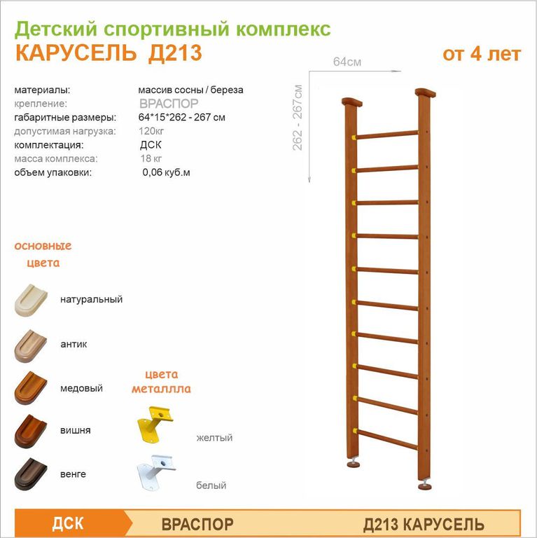 Детский спортивный комплекс Карусель Д 213 (Распорный) представляет собой базовый вариант детского спортивного комплекса. По своему усмотрению Вы можете доукомплектовать его дополнительным навесным оборудованием. Он имеет разборную конструкцию, в ее основе детали из дерева - стойки лестницы из сосны, ступени из березы.