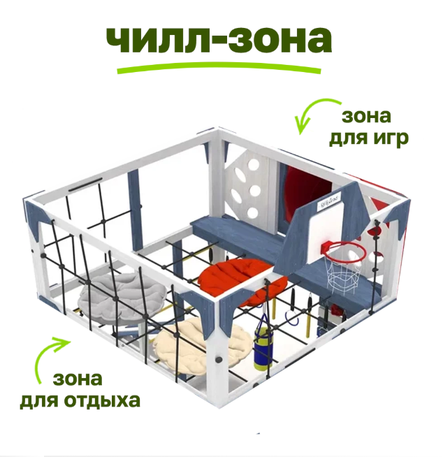 Уникальное двухзонное место для отдыха на крыше игрового комплекса! Сочетает уют мягких подушек на канатной сетке и твердую деревянную поверхность для отдыха и игр. Идеально для спокойного отдыха после активных развлечений.