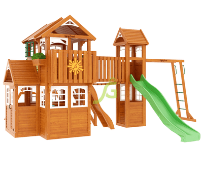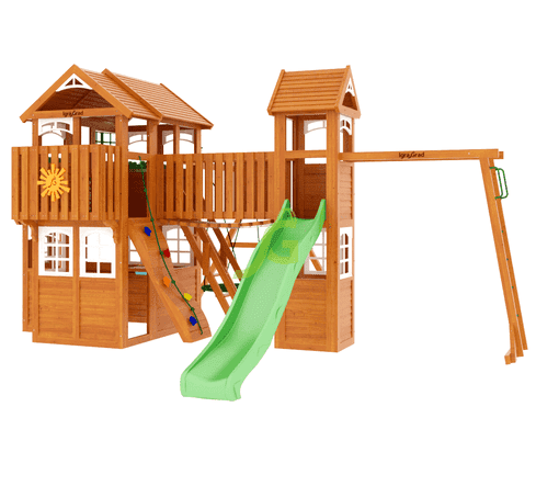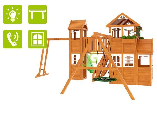 Комплексное сооружение детской площадки "Клубный домик Макси Luxe" представляет собой двухуровневый деревянный домик с увеличенным первым этажом, дополненный двускатной крышей и балконом. Чтобы ребенок мог вдоволь насладиться покорением высоты, детская площадка снабжена деревянной лестницей, подвесным мостом, скалодромом, а также канатом. Удобные качели-гнездо, диаметром 100 см, позволяют прокатить более одного ребенка или насладиться качением лежа.
