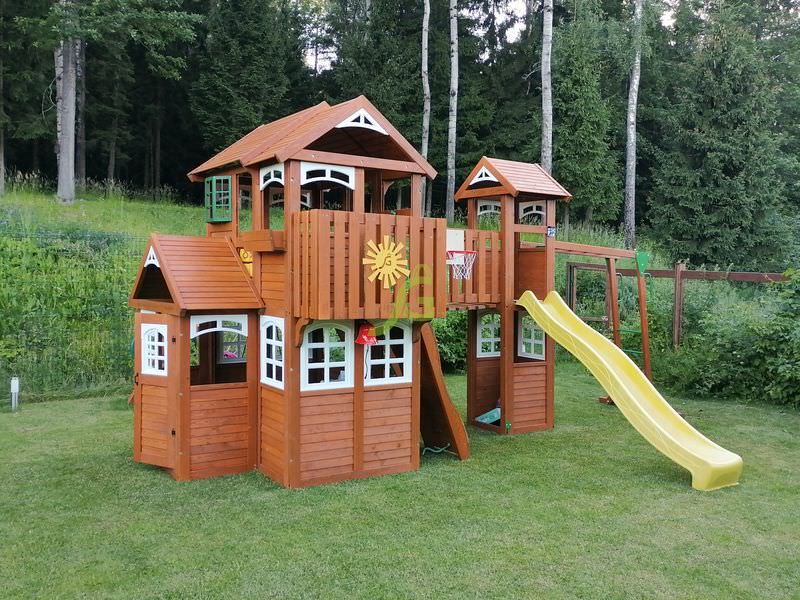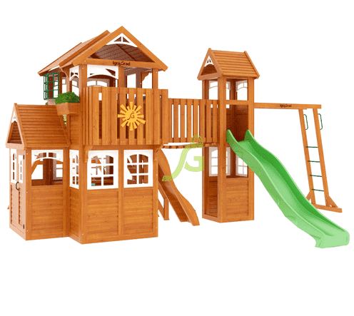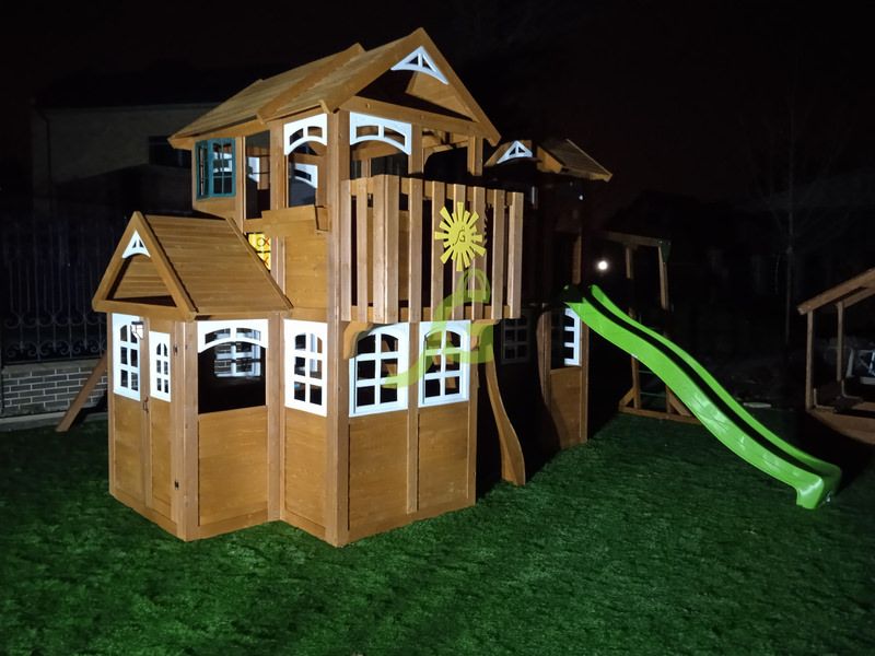 Детская площадка для дачи "Клубный домик Макси Luxe", выполненная из экологически чистых материалов и укомплектованная аксессуарами европейского качества, отвечает всем нормам и требованиям надежности и безопасности.