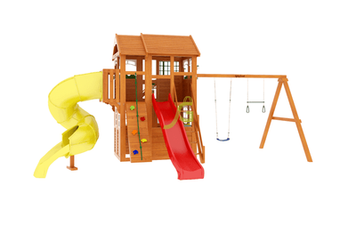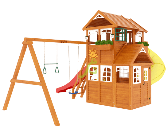 Детская игровая площадка из серии Fast «Клубный домик 3 с трубой Luxe» представляет собой современную, продуманную, эргономичную конструкцию, разработанную с учётом новейших технологий и многолетнего опыта. Она представляет собой целый комплекс, включающий двухуровневый домик, трёхметровую волновую горку, горку-трубу, лестницу-скалодром, качели, трапецию с кольцами, доску для игры в "Крестики-нолики" и даже канат.