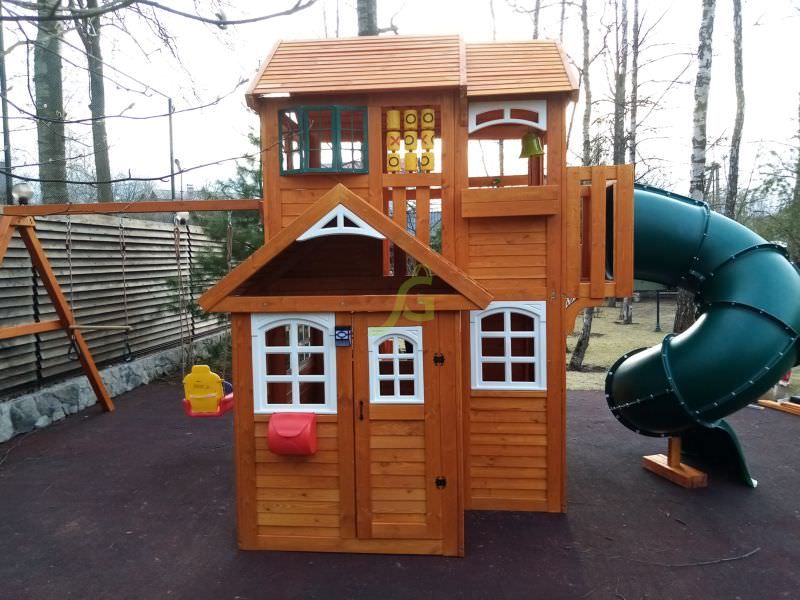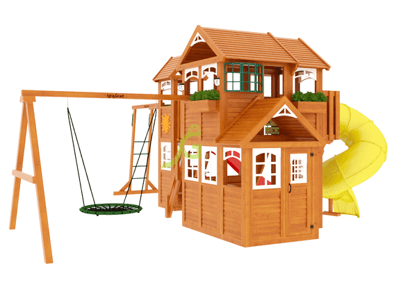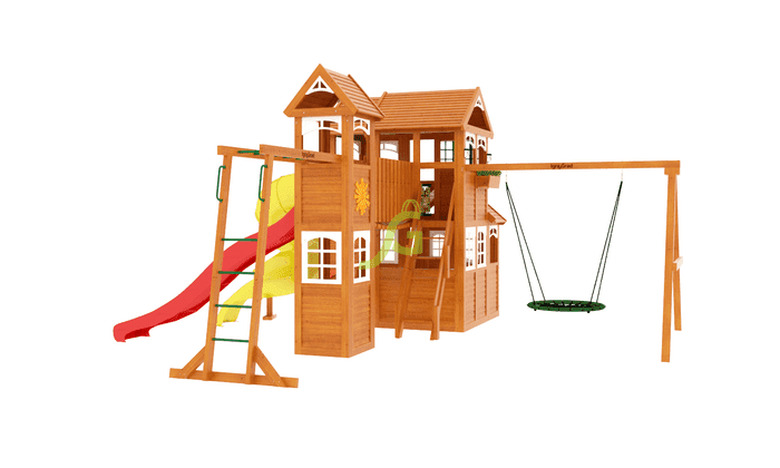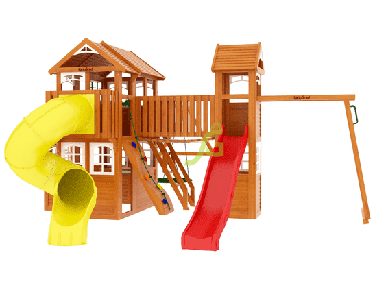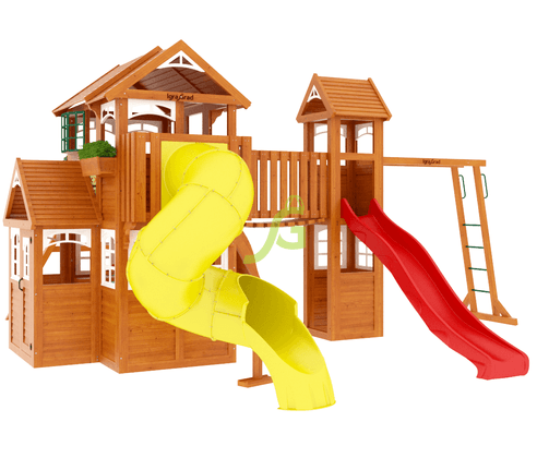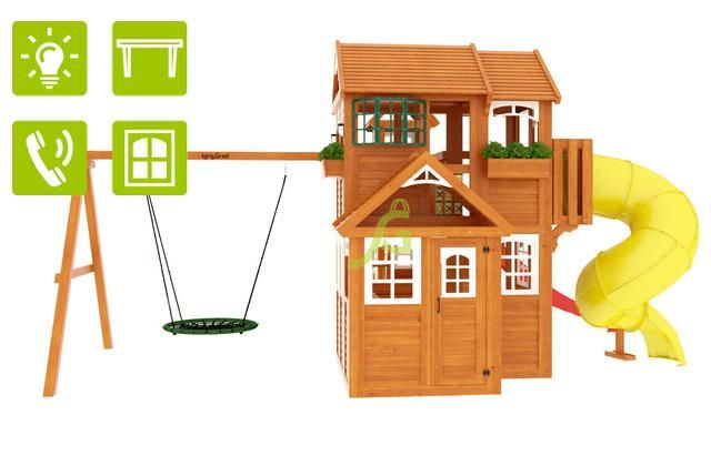 Детская площадка "Клубный домик Макси с трубой Luxe" состоит из закрытого двухуровневого деревянного домика с дверью, крышей, балконом, увеличенным первым этажом с дополнительным домиком и отдельно стоящим дополнительным двухуровневым домиком с деревянной крышей. Это целое сказочное царство для юных исследователей и маленьких принцесс. Для спортивных игр и увлекательного отдыха, площадка оснащена трехметровой волновой горкой и полуторо-метровой горкой-трубой. Любителям полазать, конструкция имеет лестницу, подвесной мост, канат, скалодром. В период отдыха от активных занятий, дети могут поиграть в «Крестики-нолики» или покачаться в просторных качелях-гнездо.