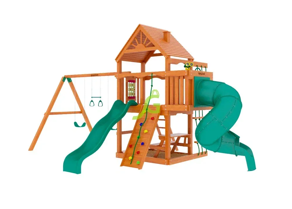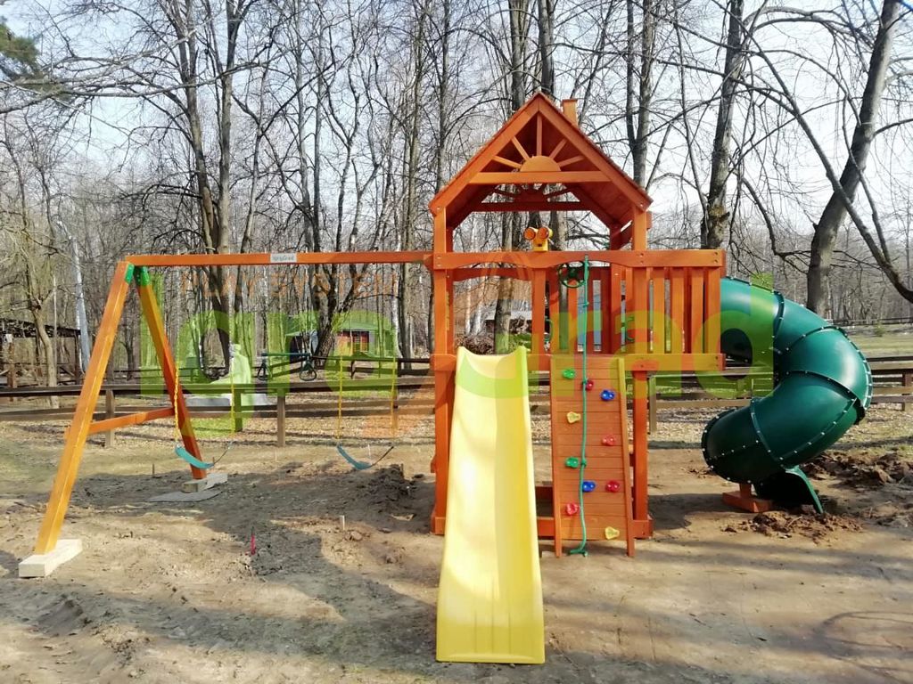 Порадуйте детвору деревянной детской площадкой «Шато с трубой» (Дерево). Стильная, красивая, многофункциональная конструкция прекрасно впишется в ландшафтный дизайн и станет настоящим другом для детей. Это невероятно! Но игровой комплекс оборудован сразу двумя горками. Одна горка имеет волнообразную форму, а другая выполнена в виде трубы. Скатываться по горке второго типа – сплошное удовольствие, даже дух захватывает.