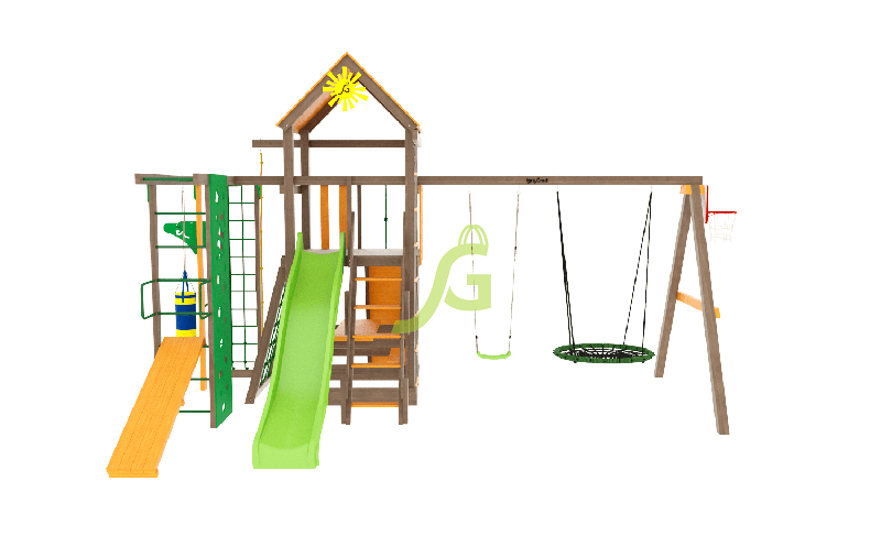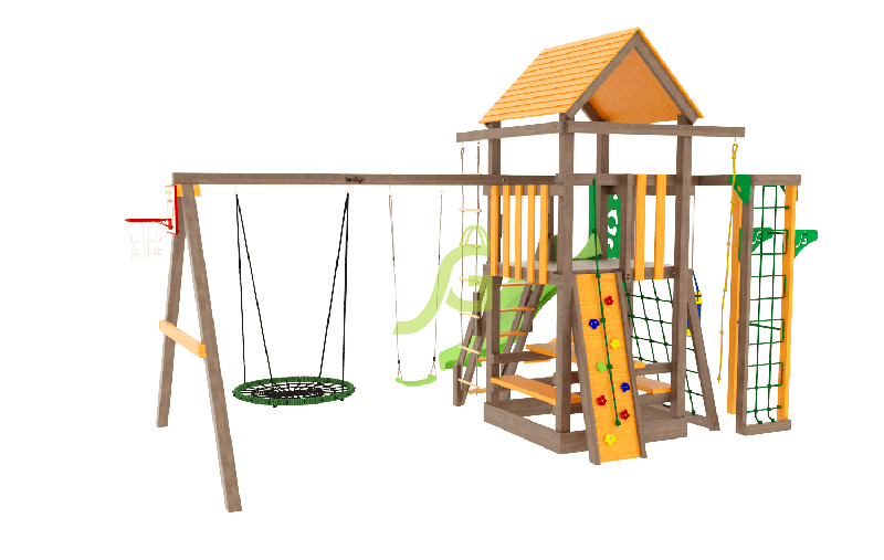По желанию клиента игровая площадка может быть укомплектована дополнительными элементами. Можно заменить обычные качели на качели-гнездо, которые очень удобны в использовании.