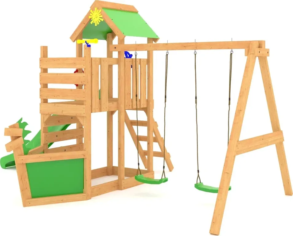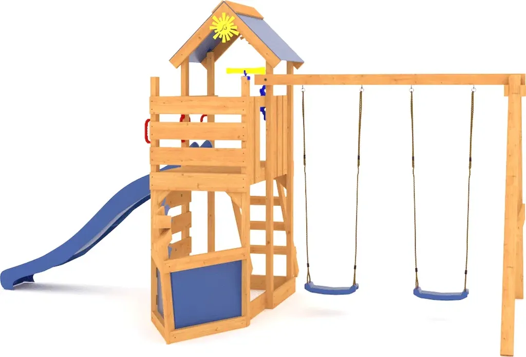 Основа игрового сооружения – брус камерной сушки размером 45х90 мм. Древесина в окрашенных площадках обработана нетоксичными составами на водной основе, поэтому она безопасна для здоровья детей и окружающей среды. Ни один материал кроме дерева не обладает терапевтическим эффектом за счёт выделения фитонцидов, благотворно воздействующих на организм. Аксессуары из пластика износостойкие и прочные.