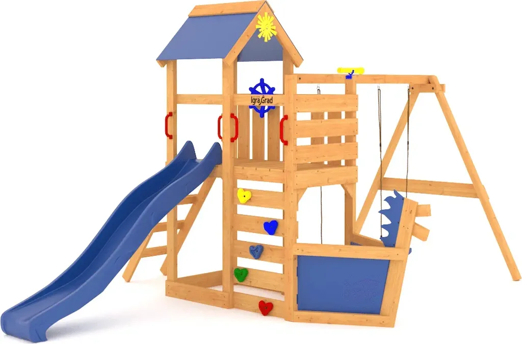 Игровой комплекс из дерева позволяет поддерживать физическую форму и совершенствовать двигательные навыки за счёт грамотно разработанной конструкции. Индивидуальный подбор комплектации может включать штурвал, баскетбольное кольцо со щитом и даже детский телефон.