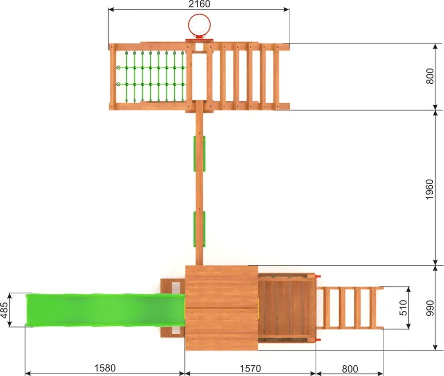 Деревянная игровая площадка включает все базовые элементы для активного времяпрепровождения: