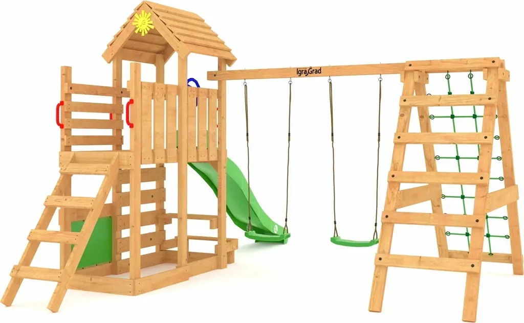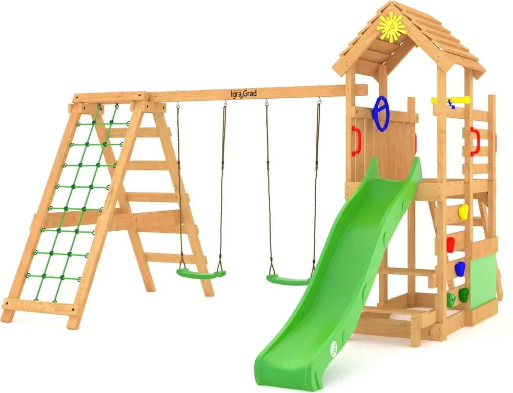 Деревянная детская площадка IgraGrad W9 – красивое и функциональное решение для создания безопасной и познавательной среды для физического, коммуникативного развития детворы.