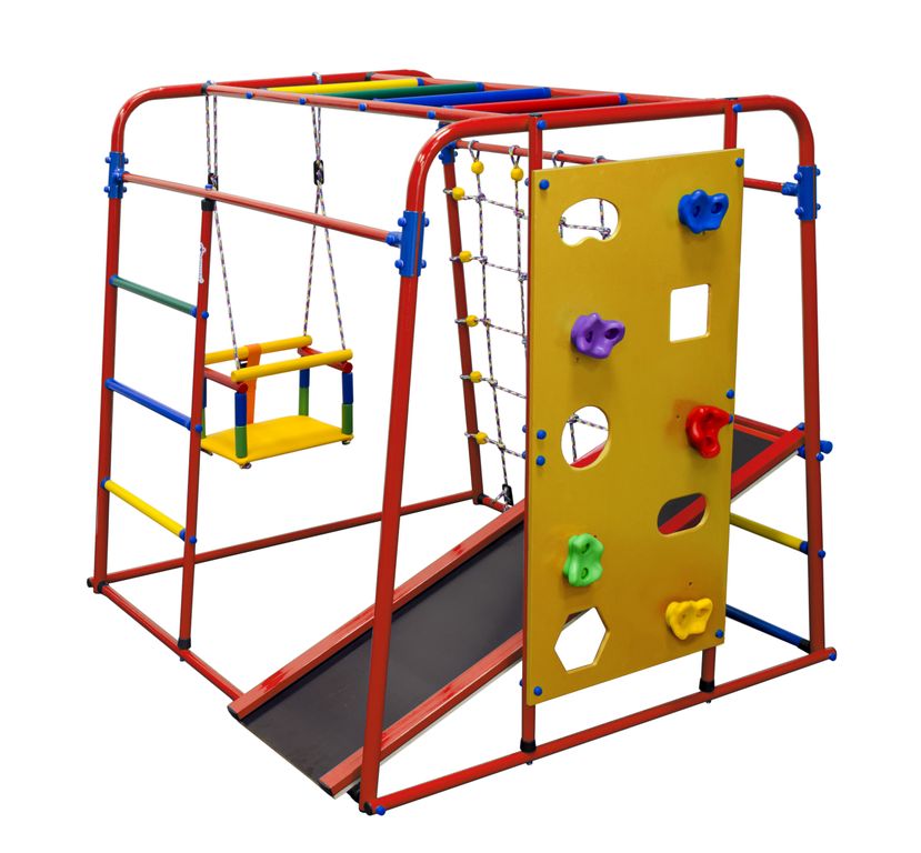 Состоит комплекс из скалодрома с зацепами, сетки-лаза, ламинированной горки, качели, рукохода. Можно доукомплектовать дополнительным оборудованием.