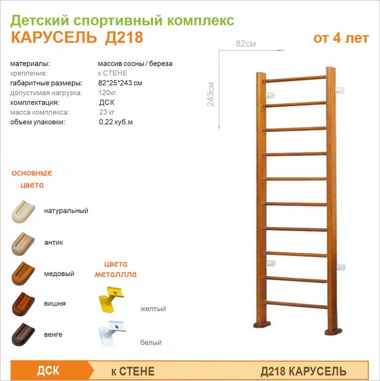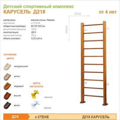 Детский спортивный комплекс Карусель Д 218 (к стене) представляет собой базовый вариант детского спортивного комплекса. По своему усмотрению Вы можете доукомплектовать его дополнительным навесным оборудованием. Он имеет разборную конструкцию, в ее основе детали из дерева - стойки лестницы из сосны, ступени из березы.