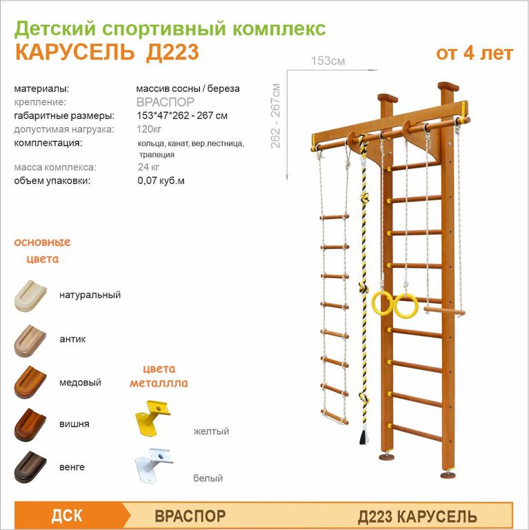 ДСК КАРУСЕЛЬ Д223 представляет собой спортивный комплекс, включающий себя такие элементы, как канат, веревочная лестница, кольца, трапеция, и шведская стенка. Комплекс позволяет развить у вашего малыша ловкость и гибкость.