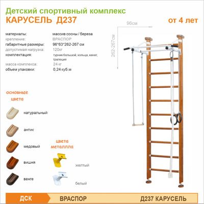 ДСК КАРУСЕЛЬ Д237 представляет собой лаконичный вариант спортивного комплекса, включающий в себя такие элементы, как канат, кольца, трапеция, турник и шведская стенка. Комплекс позволяет развить у вашего малыша ловкость и гибкость.