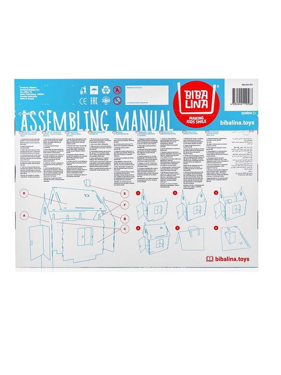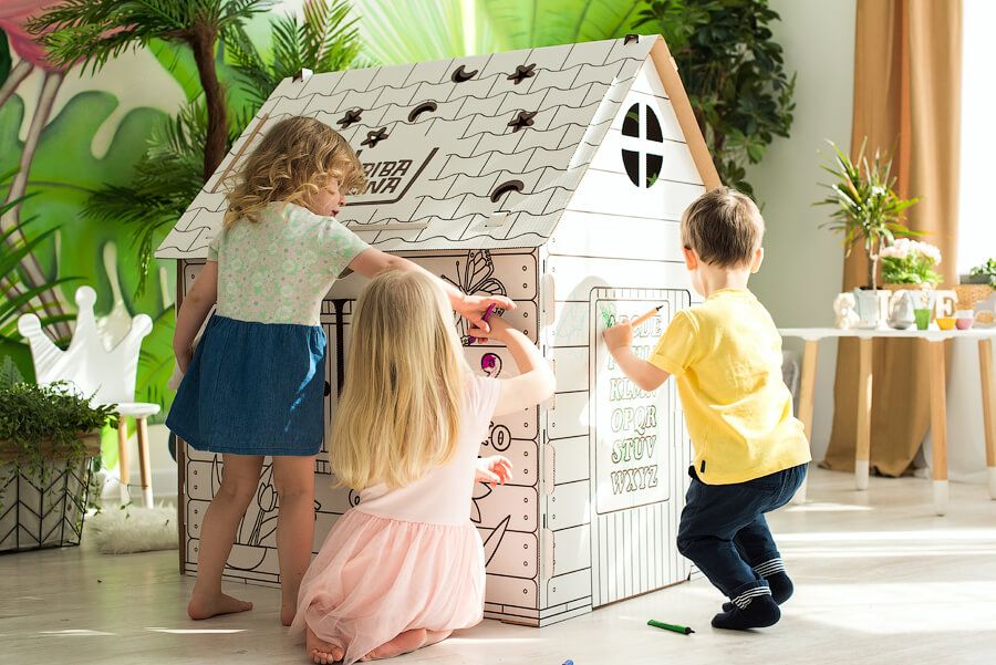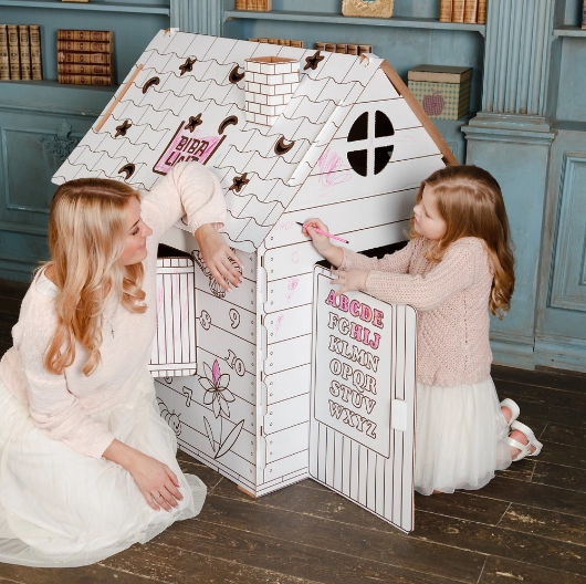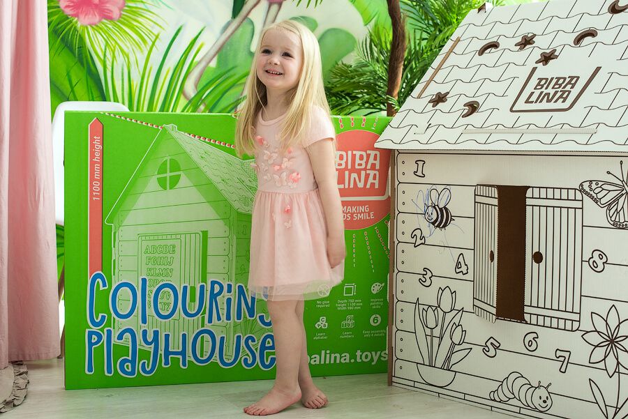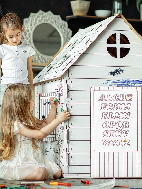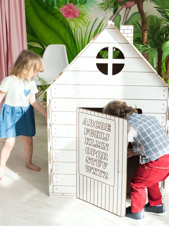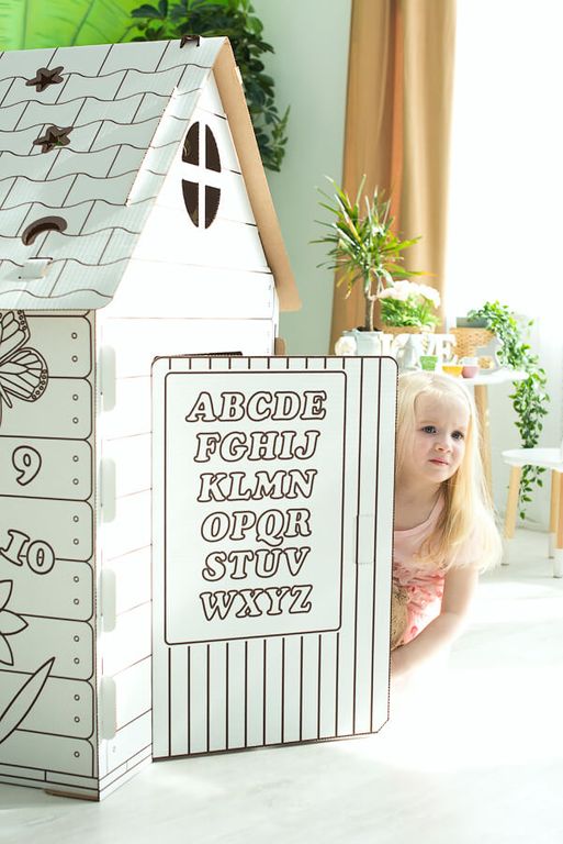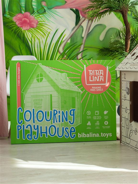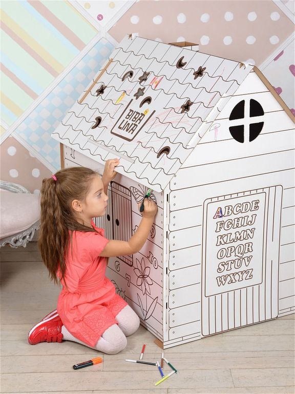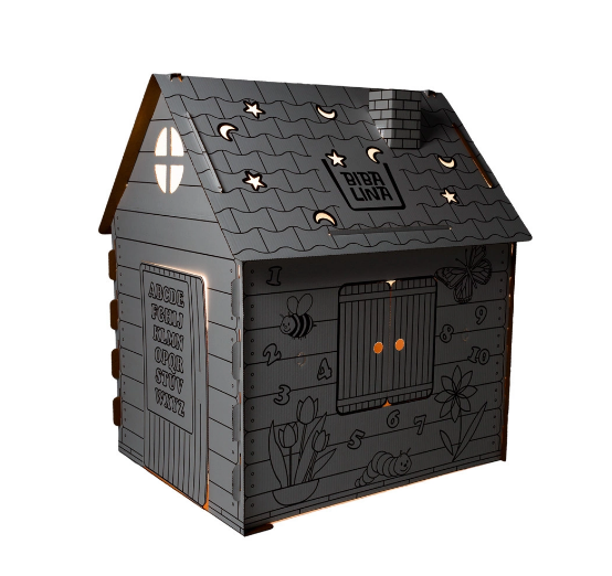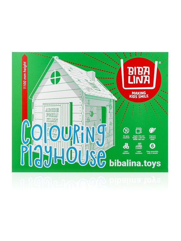 Развивающий дом-раскраска BibaLina - картонный домик с открывающимися окнами и дверью. Домик можно раскрашивать красками, фломастерами и карандашами, большие размеры позволяют свободно размещаться детишкам внутри и играть. При производстве используется экологически чистый трёхслойный гофрированный картон. Благодаря продуманной конструкции домик легко, а главное быстро собирается без использования клея и ножниц. Из 6 деталей Вы соберете его как конструктор. Уникальная особенность этой модели - буквы английского алфавита и цифры на стенах и дверях домика. Малыши в процессе игры смогут выучить английские буквы!