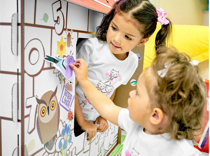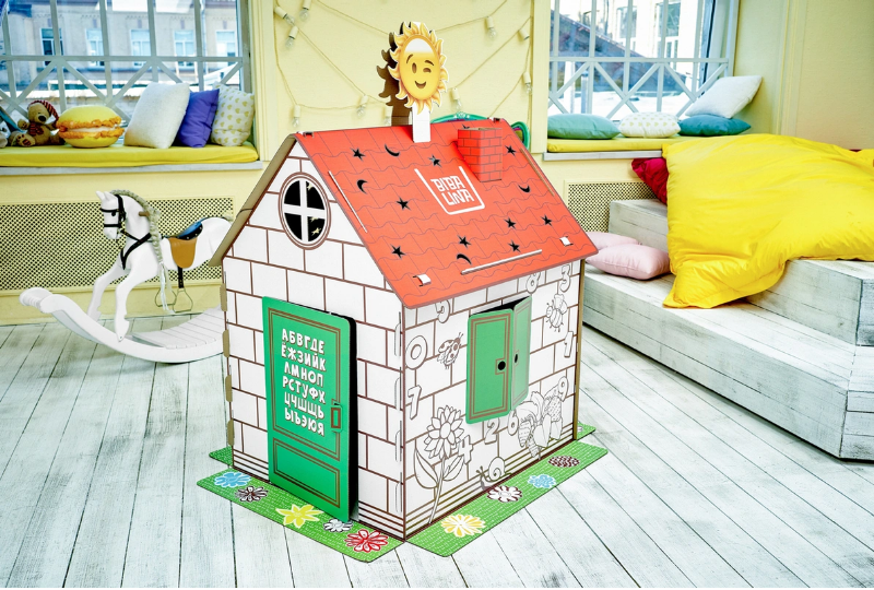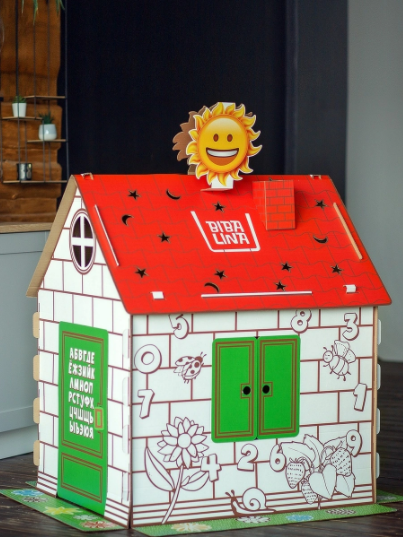 Развивающий дом-раскраска BibaLina - картонный домик с открывающимися окнами и дверью. Домик можно раскрашивать красками, фломастерами и карандашами. Большие размеры позволяют свободно размещаться детишкам внутри и играть. При производстве используется экологически чистый трёхслойный гофрированный картон. Благодаря продуманной конструкции домик легко, а главное быстро собирается без использования клея и ножниц. Из 6 деталей Вы соберете его как конструктор. Изображенные на домике буквы и цифры помогут Вашему ребенку в игровой форме выучить алфавит и числа! На крыше есть фигурная перфорация и если вечером поставить в домик любой источник освещения, то, при выключенном свете, домик превращается в красивый ночник!