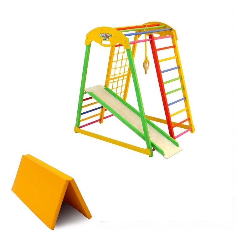 Детский спортивный комплекс раннего развития PERFETTO KIDS "Farfalla" цвет Allegrо PS-211 предназначен для детей от года. Изготовлен преимущественно из деревянных деталей: перекладины - береза, стойки - сосна, горка - фанера.