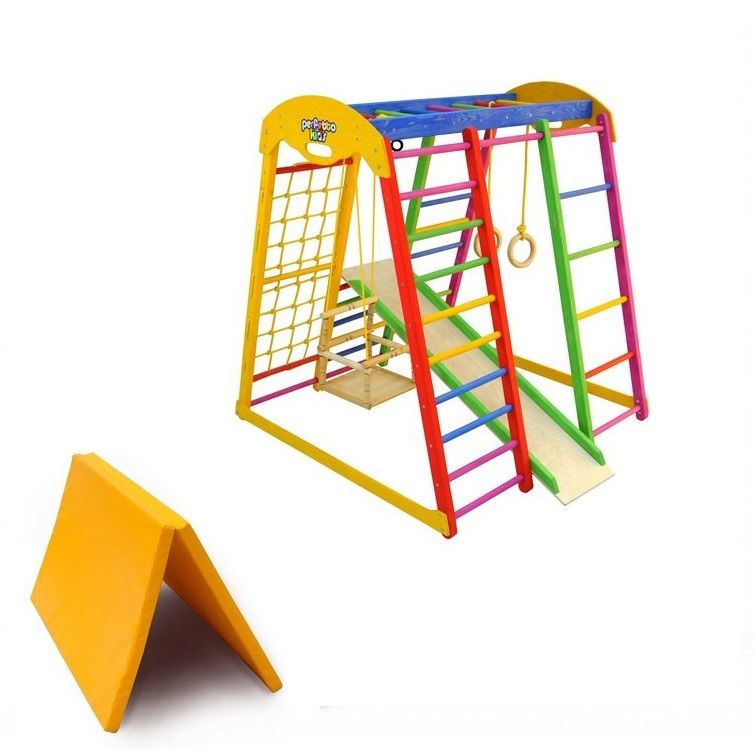 Детский спортивный комплекс раннего развития PERFETTO KIDS "Pappagallo" цвет Allegrо PS-231 предназначен для детей от года. Изготовлен преимущественно из деревянных деталей: перекладины - береза, стойки - сосна, горка - фанера.