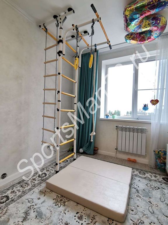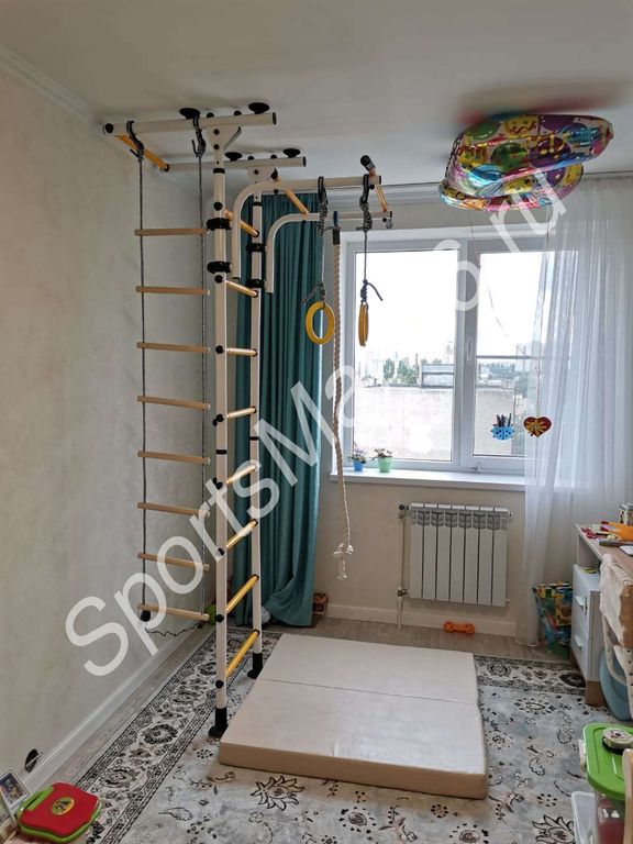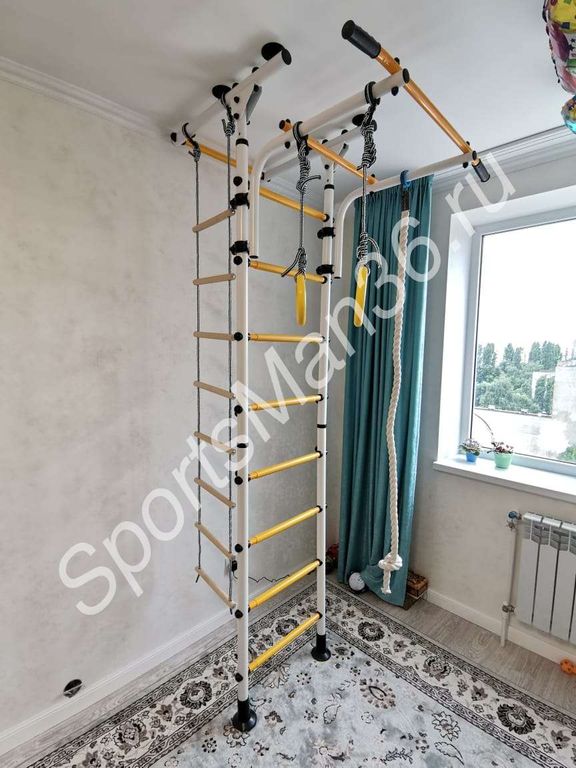 Детский спортивный комплекс с регулируемым по высоте турником и возможностью крепления навесного оборудования с противоположной стороны от турника.