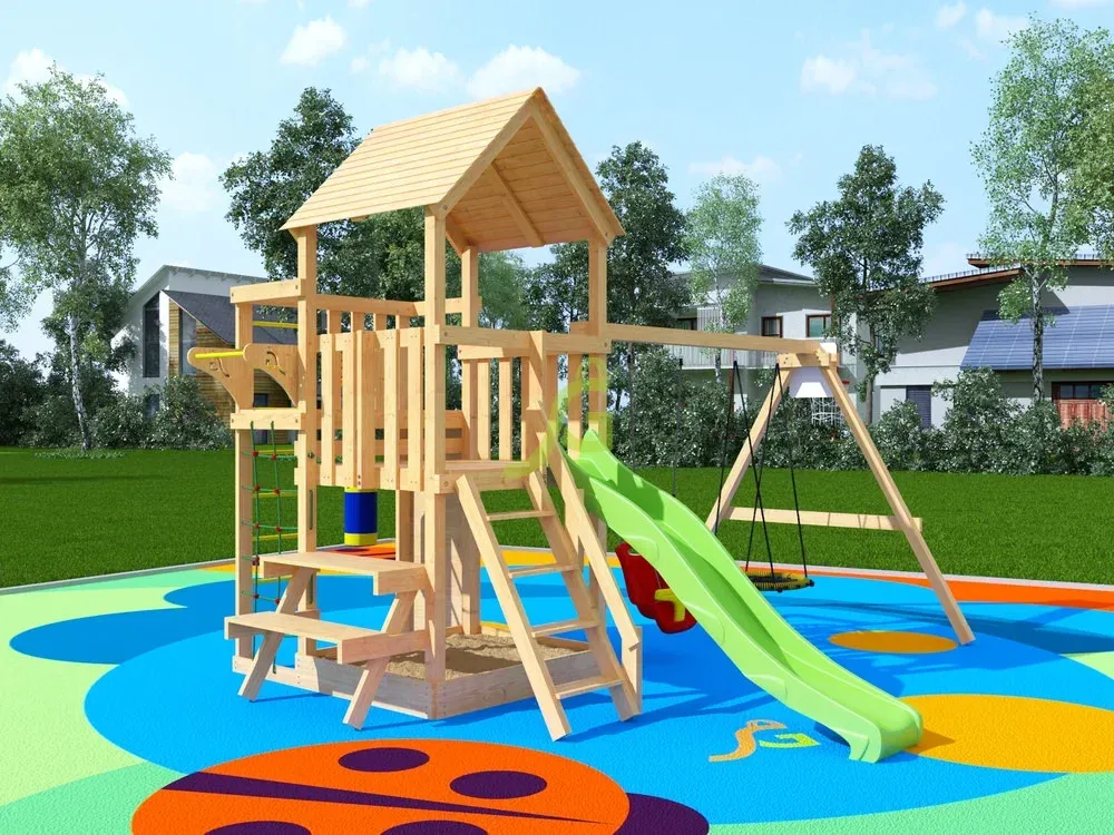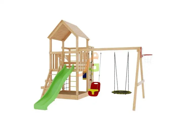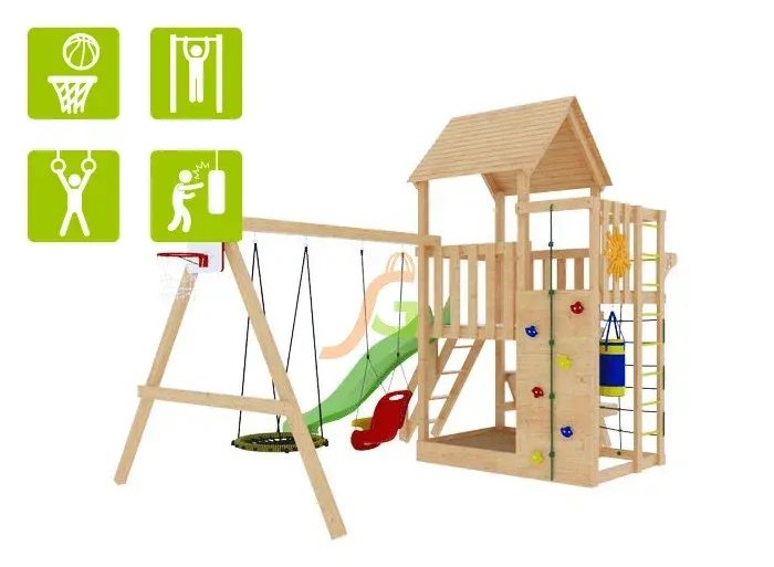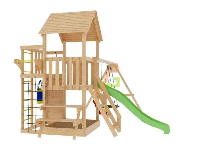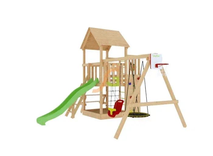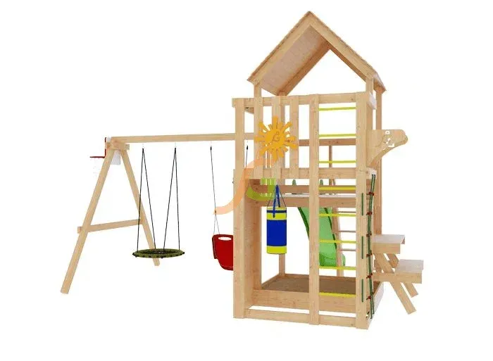 Конструкция этого игрового комплекса для дачи сборная. Каждый покупатель имеет возможность собрать детскую игровую площадку своими руками во дворе. Все детали игровой площадки изготовлены из высококачественной древесины северных широт и пластика. В комплекте есть всё необходимое для самостоятельной установки игровой зоны, даже шаблон с разметкой под саморезы. Основная конструкция выполнена из массива дерева в натуральном цвете, поэтому можно вместе с ребенком и с помощью безопасных красок раскрасить новую игрушку малыша.
