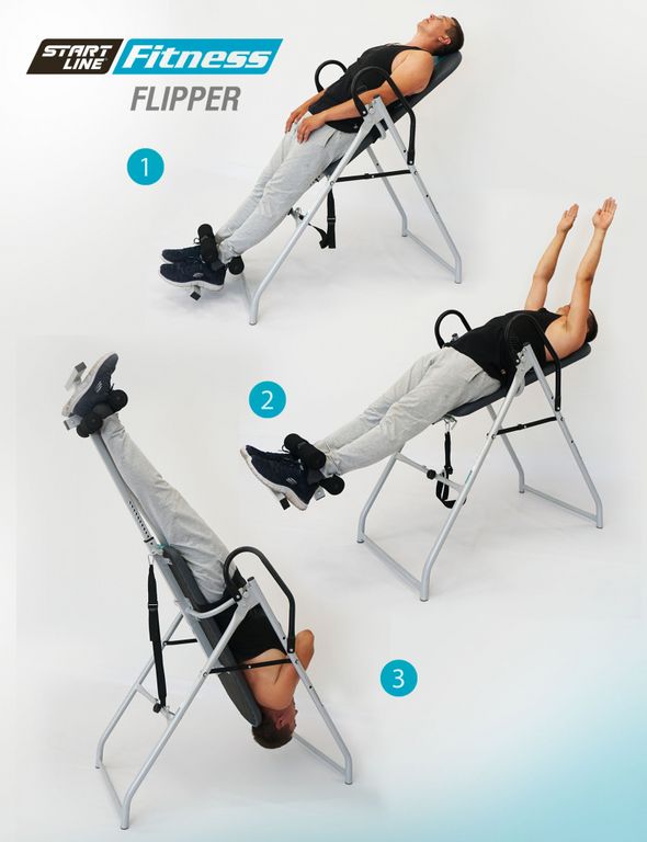 Упражнения на инверсионном столе Flipper помогут Вам: устранить или ослабить боль в спине, расслабить мышцы, улучшить осанку, облегчить состояние при варикозном расширении вен, увеличить приток кислорода к головному мозгу, улучшить кровообращение, снять стресс и напряжение в мышцах.