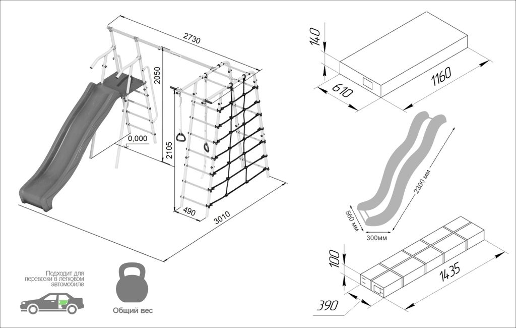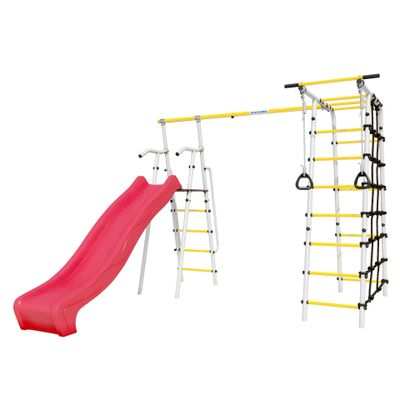 Комплектация: горка, кольца гимнастические, канатный лаз, шведская стенка, турник