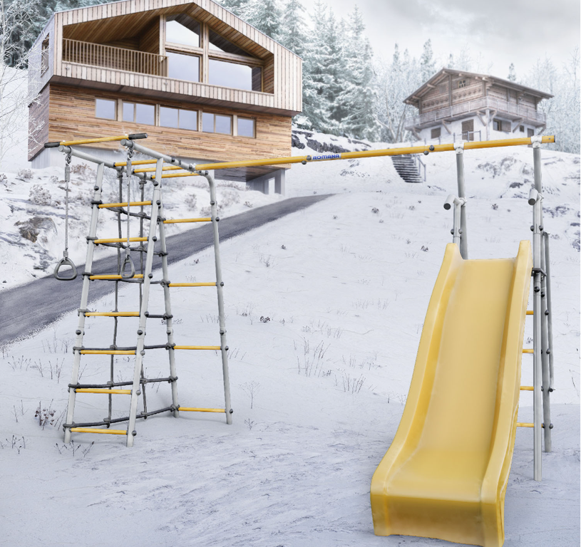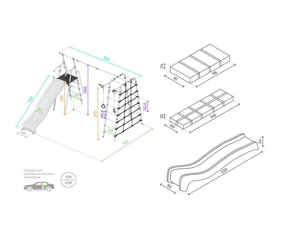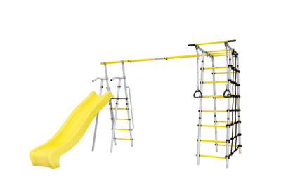 Комплектация: горка, кольца гимнастические, веревочный лаз, шведская стенка, рукоход турник