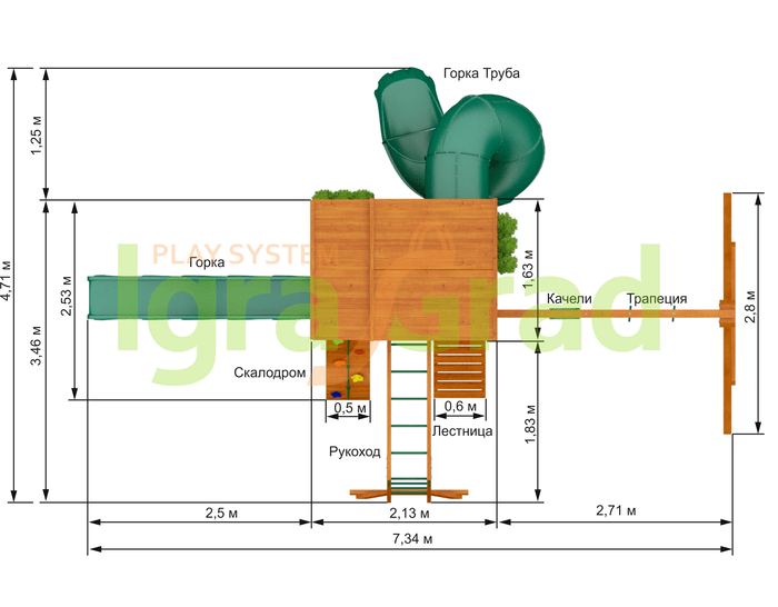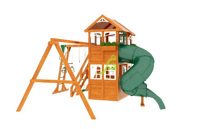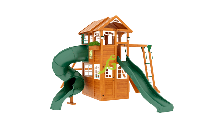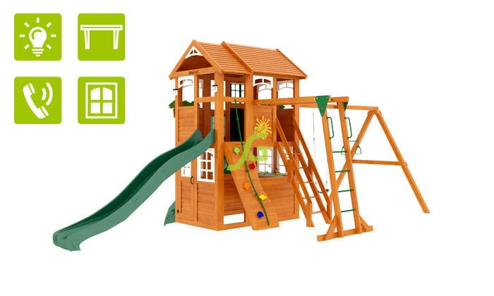 Детская площадка для дачи включает в себя целый игровой комплекс, в который входит: закрытый двухуровневый домик (с деревянной крышей и дверью), рукоход, скалодром, два вида горок (волновая и горка-труба), доска для игры в “Крестики-нолики”, разнообразные качели, канат и многие другие комплектующие элементы. Маленькие альпинисты оценят надежность скалодрома и страховочных канатов. Комплекс достаточно прочный, безопасный и экологичный. В нем вы не найдете острых углов, а крепления настолько надежные, что можете не волноваться о безопасности своего ребенка во время игры.