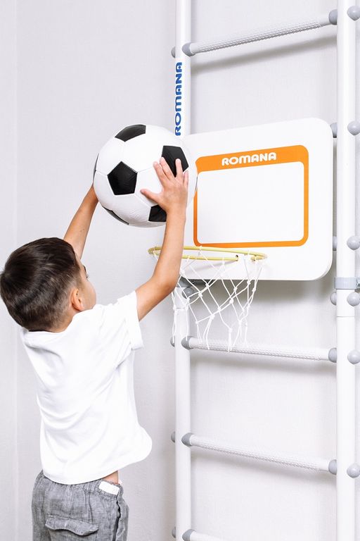 Щит баскетбольный ROMANA для шведской стенки отличное дополнение к детскому спортивному комплексу развивающее координацию и ловкость ребенка. Он крепится к перекладинам шведской стенки на необходимую высоту в зависимости от роста и возраста ребенка.