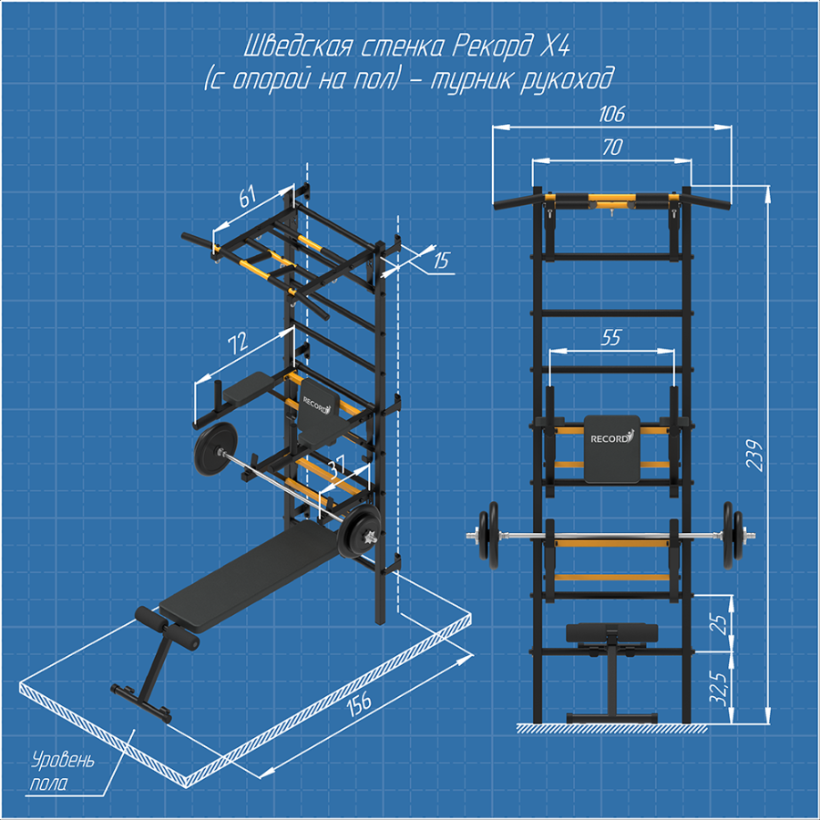 Шведская стенка сo съемным турником Рукоход (6 хватов + 5 подвесов для размещения детского навесного оборудования, увеличенный вылет от стенки), специальным упором для штанги ПРО и скамьей для пресса и жима лежа с возможностью изменения угла наклона спинки.
