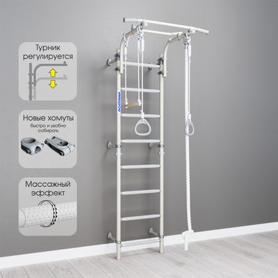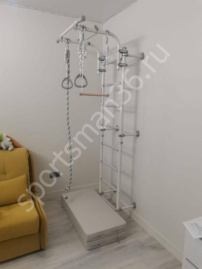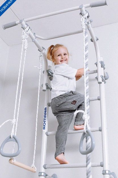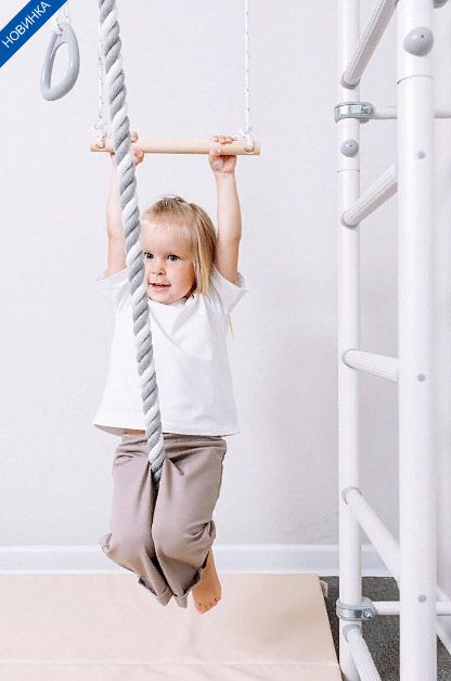 Комплектация: канат, кольца и трапеция, лестница гимнастическая, турник, регулируемый по высоте.