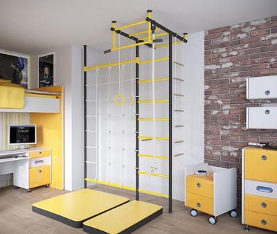 Спортивный комплекс представляет собой сборно-разборную конструкцию из металлических труб, закрепленных между потолком и полом в распор.