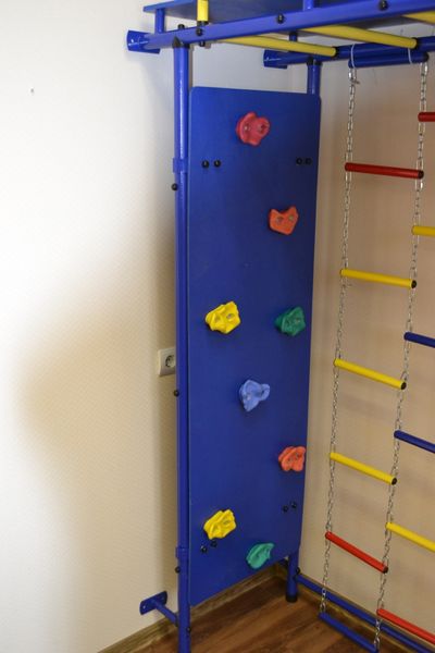 Основой скалодрома служит фанера на которую винтами с забивными гайками крепятся 8 профессиональных камней. Вешается скалодром на перекладины детского спортивного комплекса.