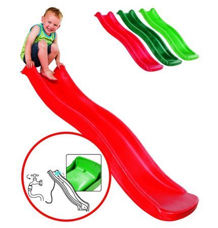 К данной модели есть возможность подключения воды – с обратной стороны в верху горки есть специальный штуцер, изначально без отверстия. Просверлив отверстие и подведя воду, горка превратится в скат в бассейн.