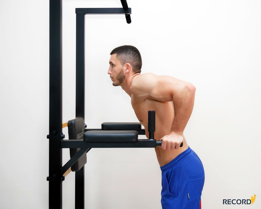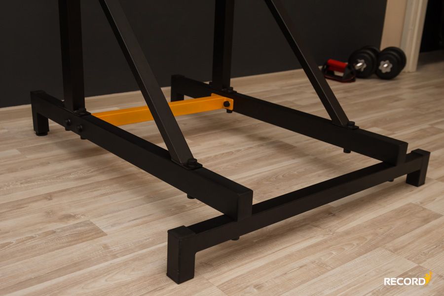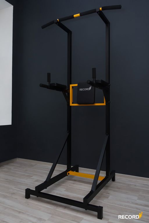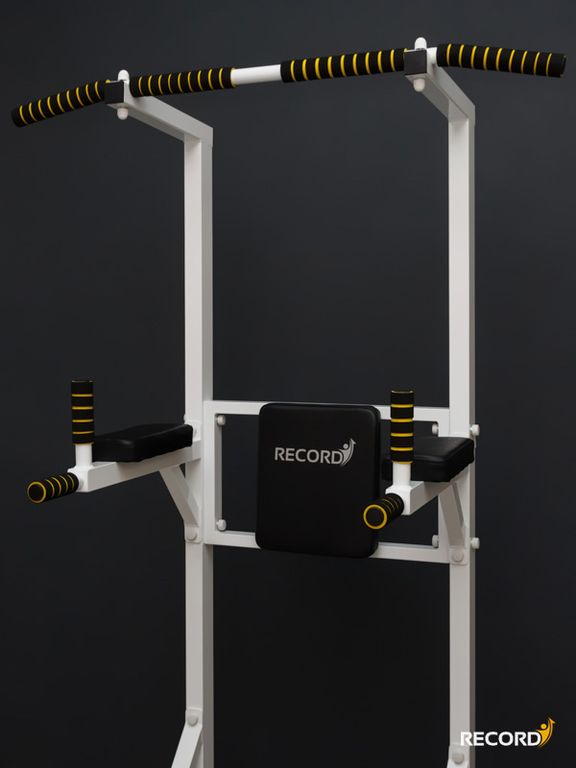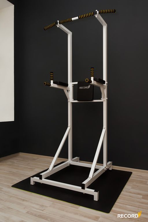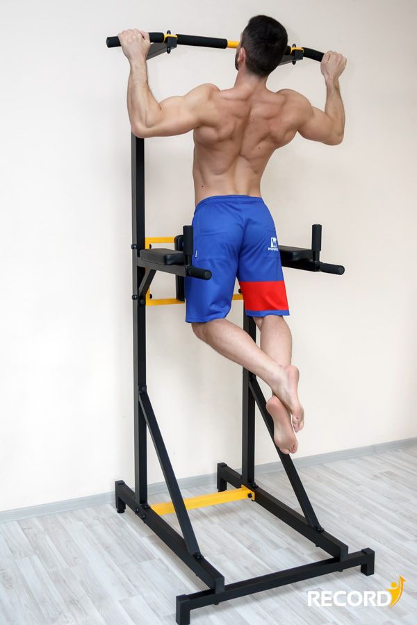 Турник напольный Рекорд 3 в 1 "Турник + Брусья + Пресс" позволяет заниматься на турнике, а также отжиматься на брусьях и тренеровать мышцы пресса, поднимая ноги.