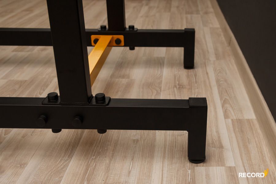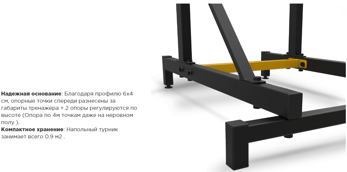 Турник имеет четыре напольные опоры. Для устойчивости конструкции две опоры спереди разнесены за гарабариты тренажера. А две опоры сзади регулируются по высоте благодаря этому тренажер не шатается и не дрожит при занятиях, даже на неровном полу.