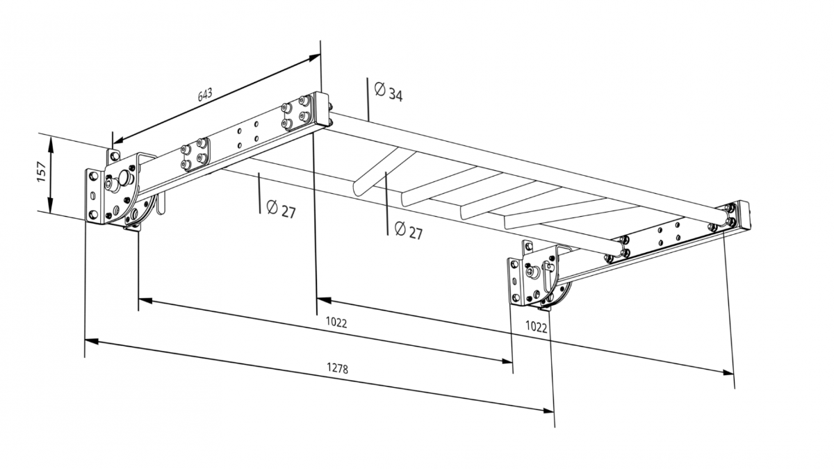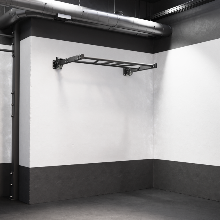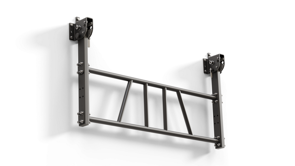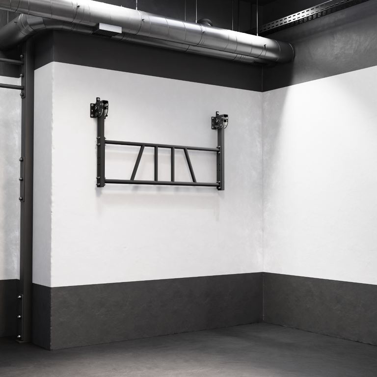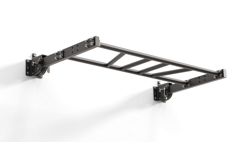 Турник настенный с перекладиной «Мультихват», складной механизм. После выполнения упражнений механизм позволяет, сложить турник вниз к стене. При раскладывании кронштейны фиксируются в горизонтальном положении при помощи фиксирующего штифта. Для плавного хода и защиты металлических частей в местах трения предусмотрены пластины из СВМПЭ (сверхвысокомалекулярный полиэтилен).