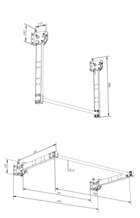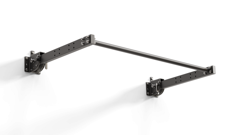 Турник настенный со складным механизмом. Механизм позволяет после выполнения упражнений сложить турник вниз к стене. При раскладывании кронштейны фиксируются в горизонтальном положении при помощи фиксирующего штифта. Для плавного хода и защиты металлических частей в местах трения предусмотрены пластины из СВМПЭ (сверхвысокомалекулярный полиэтилен).
