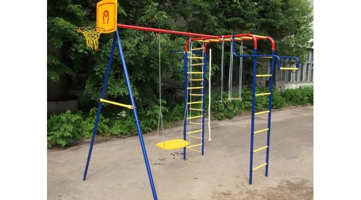 Окрашен комплекс качественной порошковой эмалью, монтируется на улице путем бетонирования специальных крепежных стаканов, входящих в комплект, которые крепятся болтами к стойкам комплекса.