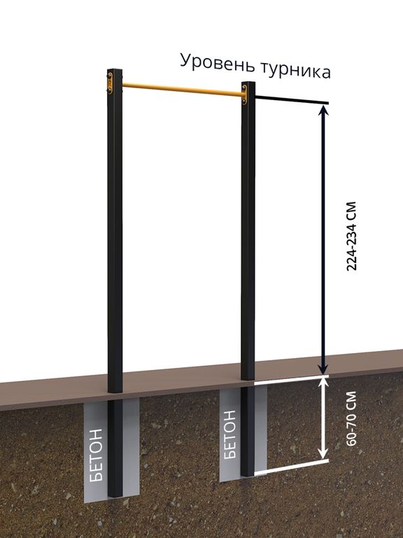 Вертикальные стойки трубы имеют длину 300 см. Рекомендуется устанавливать их на глубину от 60 до 70 см в грунт. В качестве заполнителя мест установки рекомендуется использовать бетонную смесь. Для сборки турников и брусьев понадобится гаечный ключ М10 и ключ М12 для сборки шведской стенки.