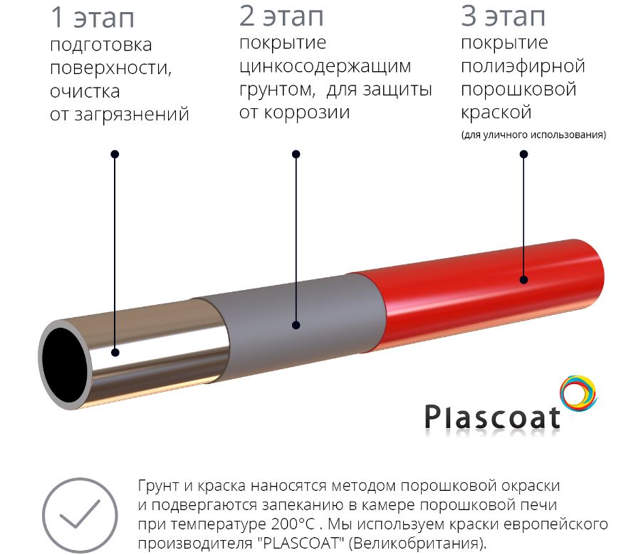 Все металлические части тренажеров имеют двухслойную окраску: 1) Первый слой - это цинкосодержащий грунт, который наносится на тщательно подготовленную поверхность и обеспечивает дополнительную защиту от коррозии; 2) Второй слой - финишное покрытие полиэфирной порошковой краской (для уличного использования). Оба слоя наносятся методом порошковой окраски и подвергаются запеканию в камере порошковой печи при температуре 200°C . Используются краски европейского производителя "PLASCOAT" (Великобритания).
