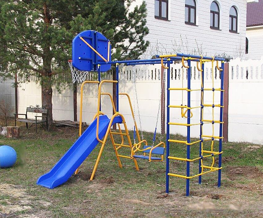 Уличный комплекс "Малыш-Дачник" с горкой, сеткой для лазания и баскетбольным кольцом серии "Веселый непоседа" - отличный комплекс для физического развития Вашего малыша!